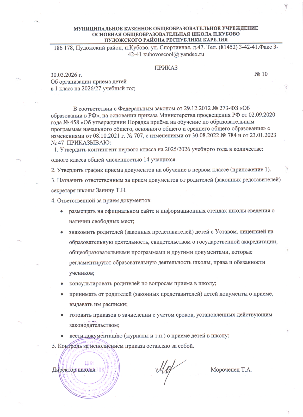 На основании приказа Министерства просвещения РФ от 02.09.2020 года № 458 «Об утверждении Порядка приёма на обучение по образовательным программам начального общего, основного общего и среднего общего образования» с изменениями от 08.10.2021 г. № 707, с изменениями от 30.08.2022 № 784 и от 23.01.2023 № 47 прием заявлений в 1 класс на 2026–2027 учебный год начинается